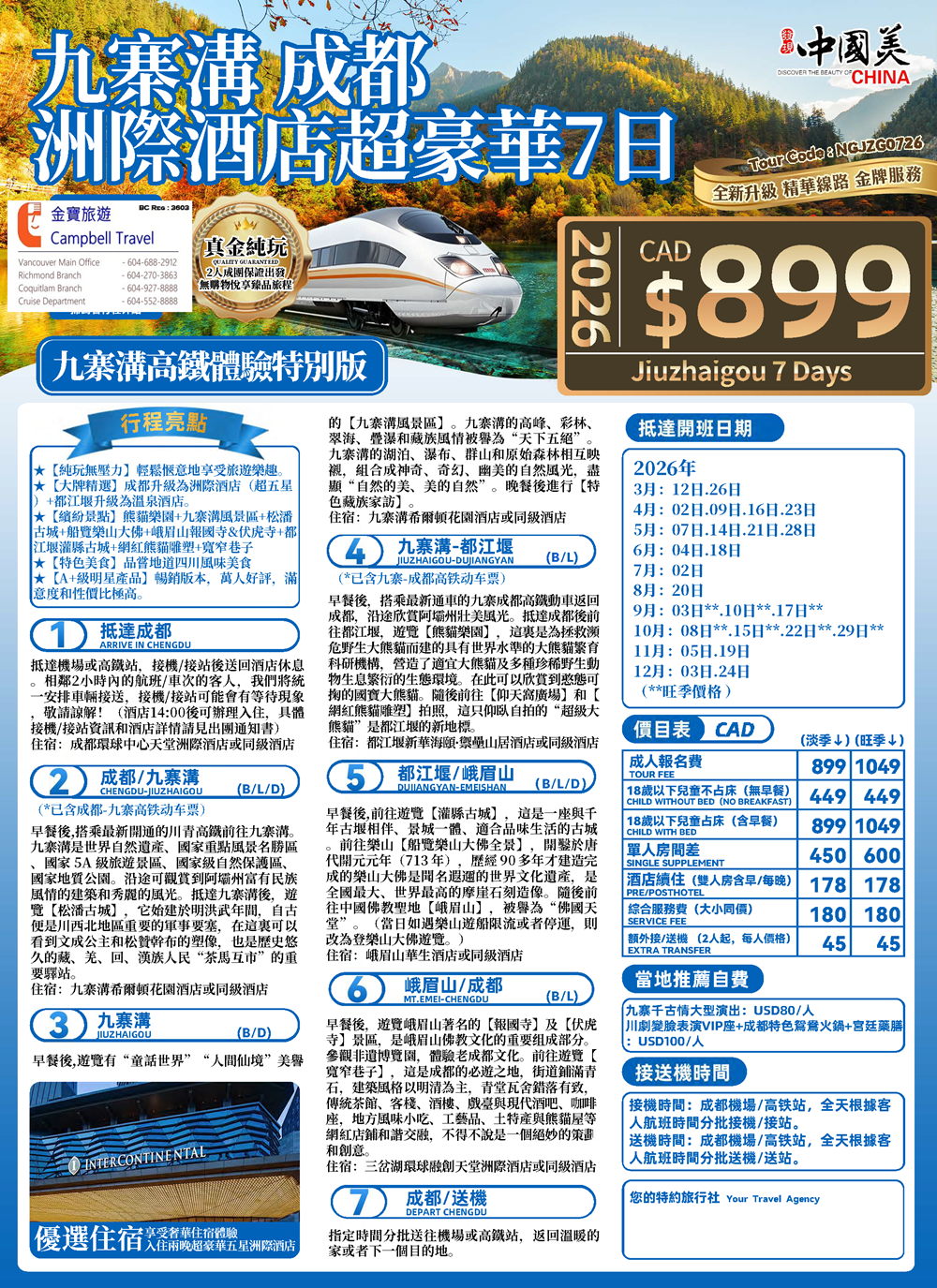 2026 九寨溝 成都樂山峨眉7日(中國美) (純玩)