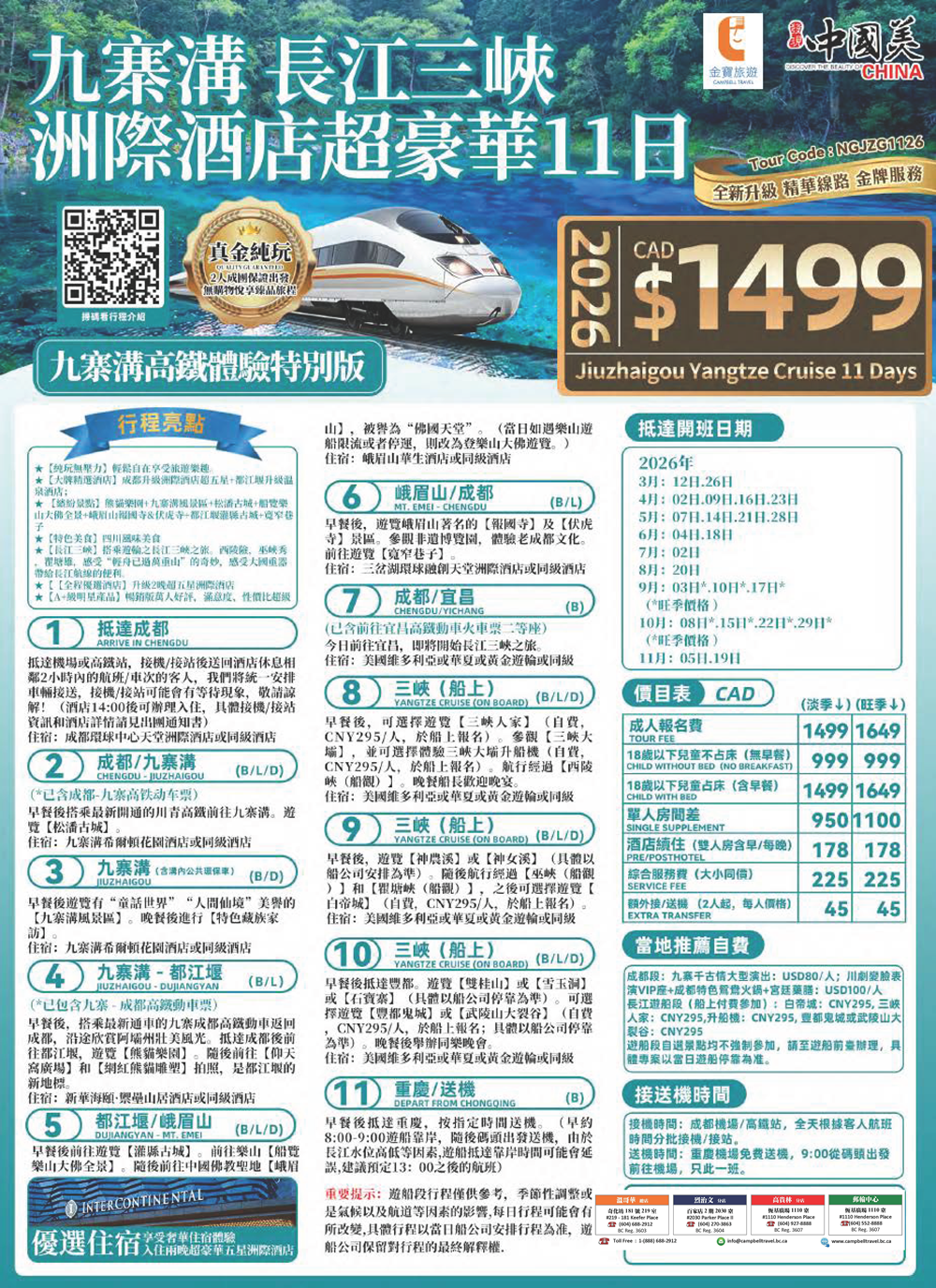 2026 九寨溝 長江三峽11日 (中國美) (純玩)