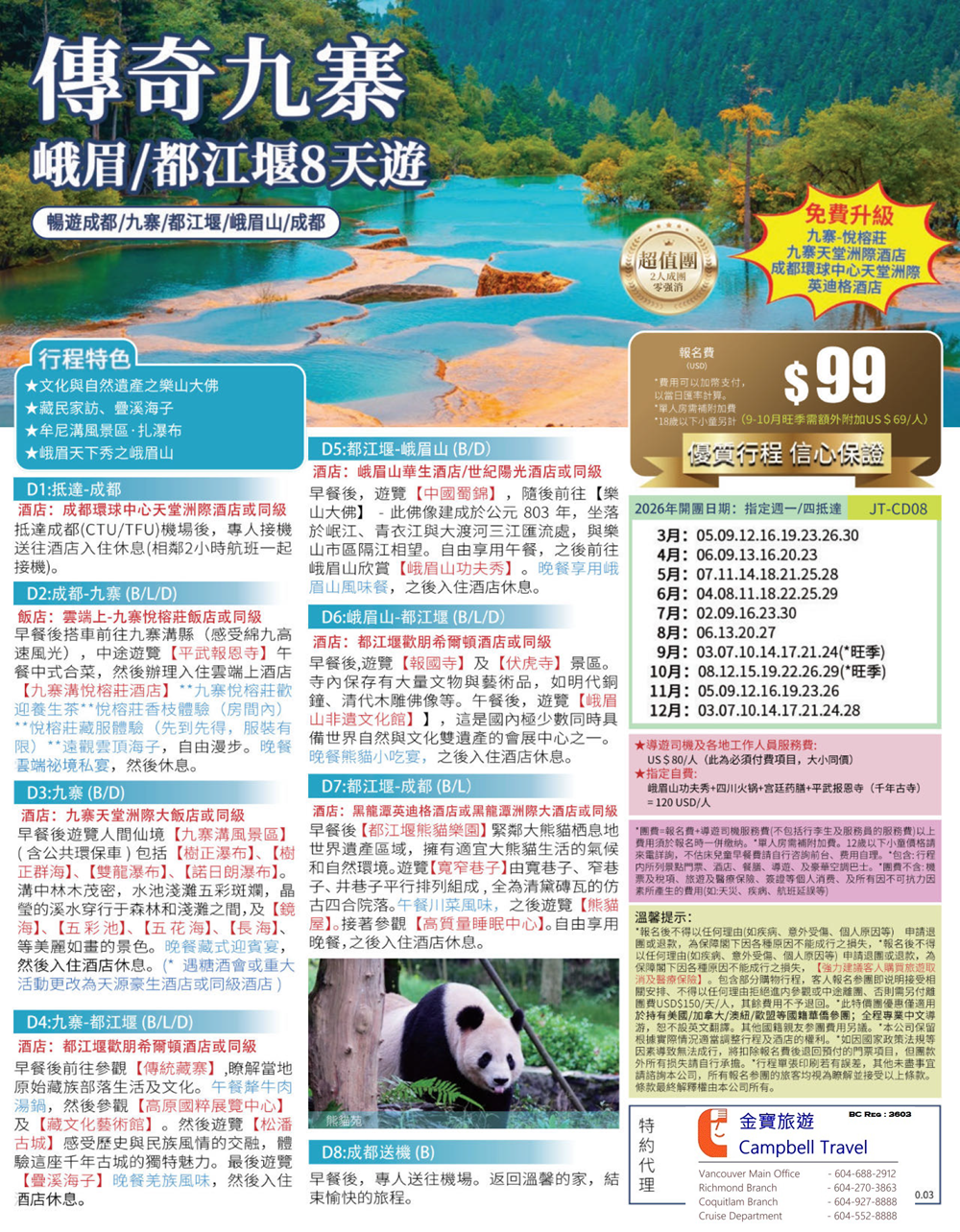 傳奇九寨 ‧ 峨眉/都江堰 8 天遊 (2026) (JT)